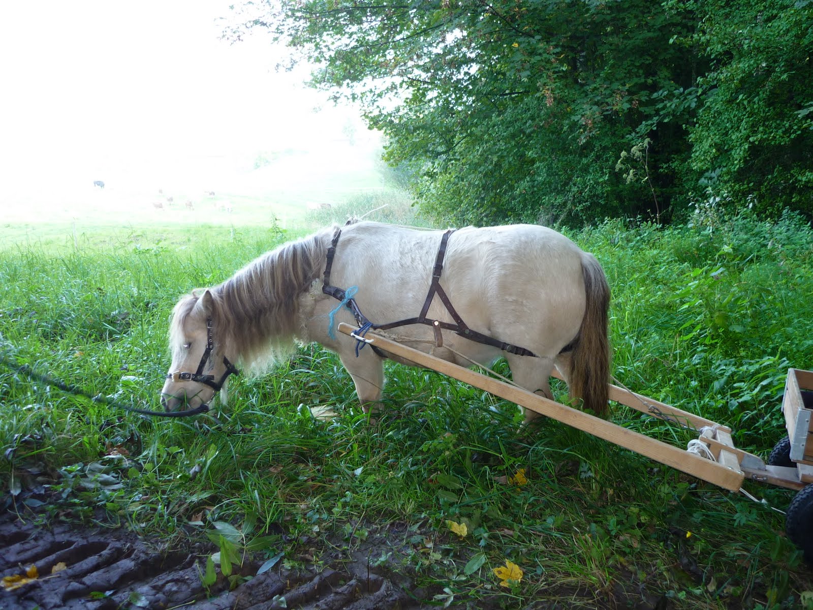 Abwärts wird es wilder, plötzlich stehen wir quer im Bord, aber die Nüsse sind noch im Kessel. Wow wird Brigitte blaue Flecken haben! Dann werden Baumnüsse gesammelt, während die Ponys grasen dürfen Beim Aufstieg ist alles ruhig